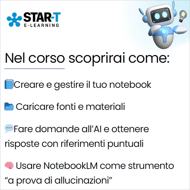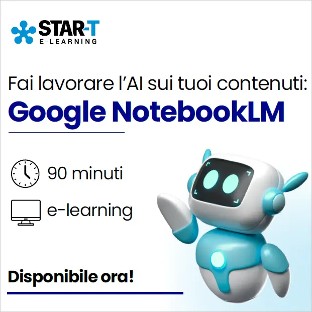 Sono orgoglioso di poter annunciare l’uscita del mio corso di formazione su Google NotebookLM sviluppato e distribuito per conto di STAR-T srl , società fornitrice di corsi in e-learning rivolti alle aziende.
